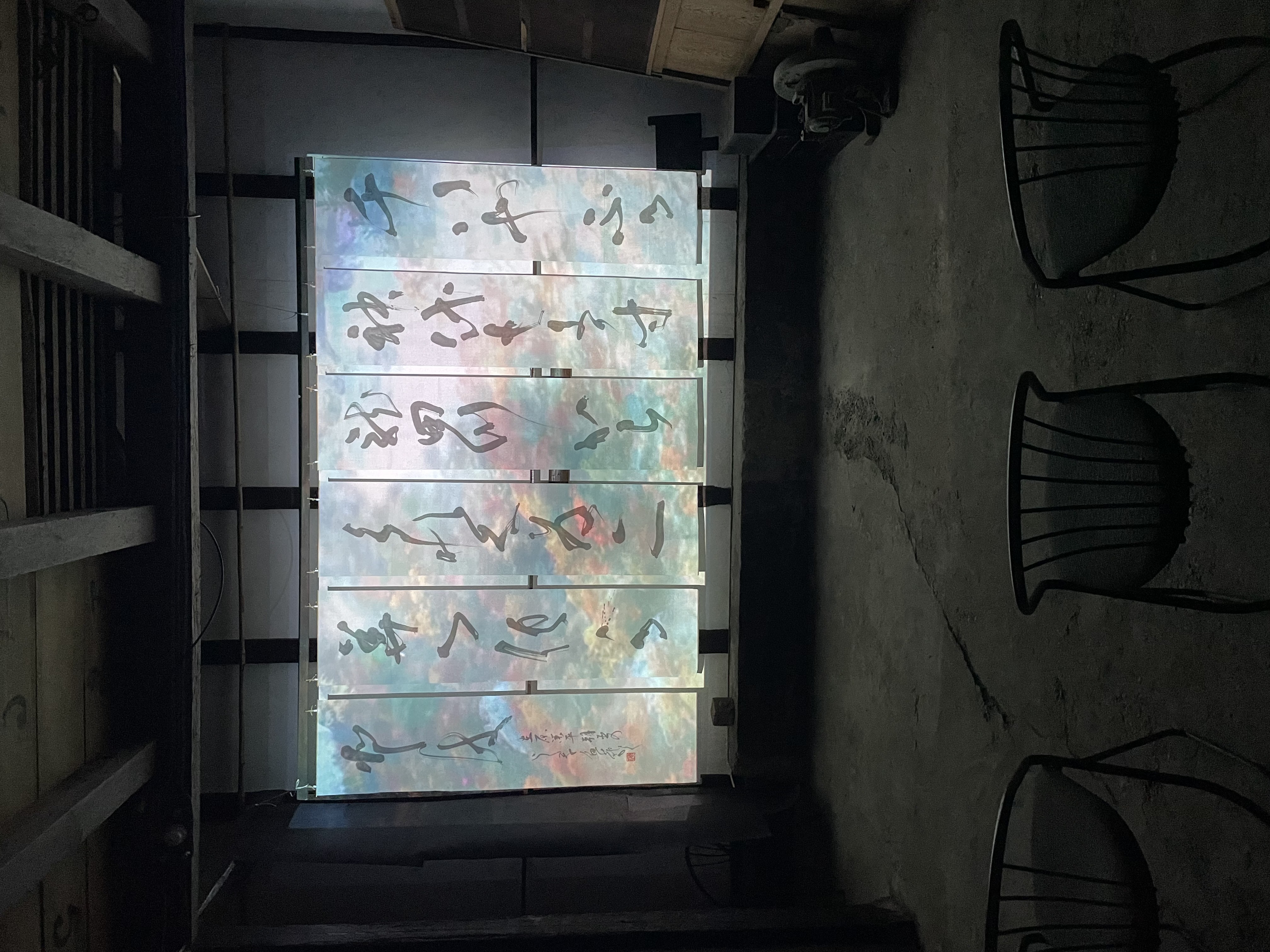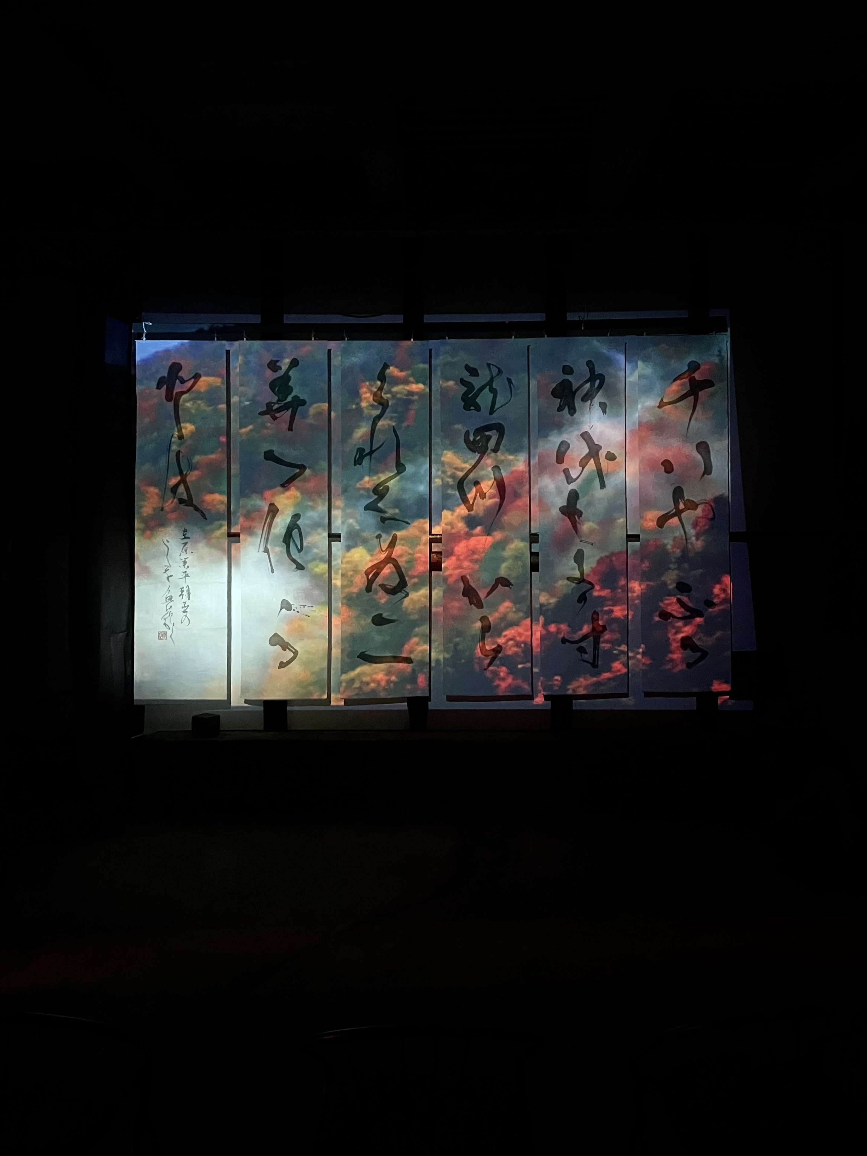私は昨年に引き続き、空間造形作家の若林斉さんと一緒に大きな酒蔵で、『映像と書のコラボアート』を展示。