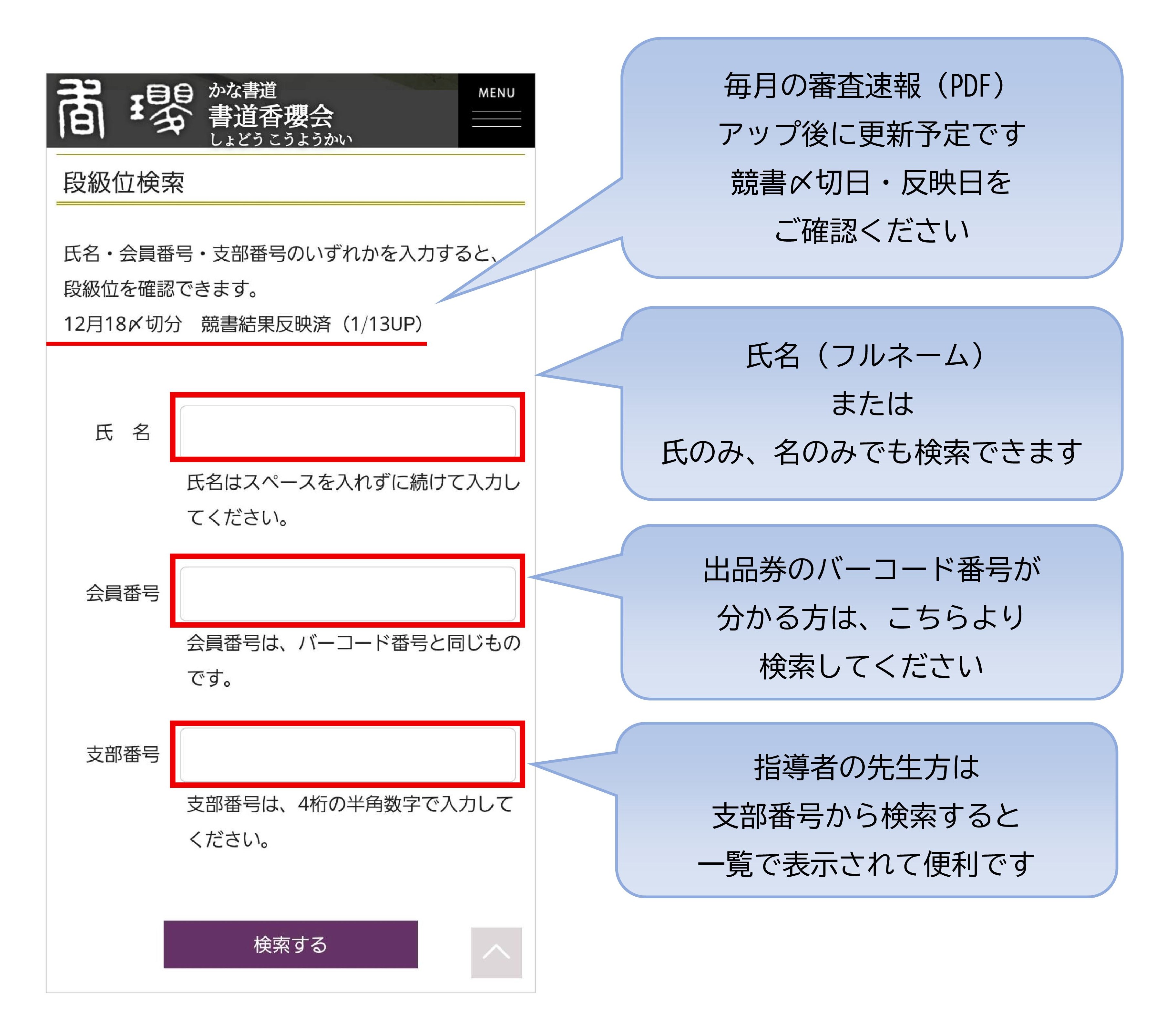 この度、皆様からのご要望にお応えし、いつでもご自身の最新段級位を検索できるシステム を追加いたしました。